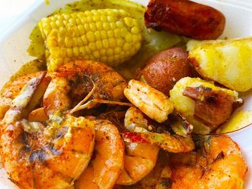 All shrimp platters include rice, potato, and sweet corn on the cob.