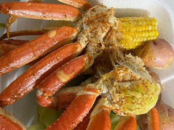 All snow crab leg platters include rice, potato, and sweet corn on the cob.